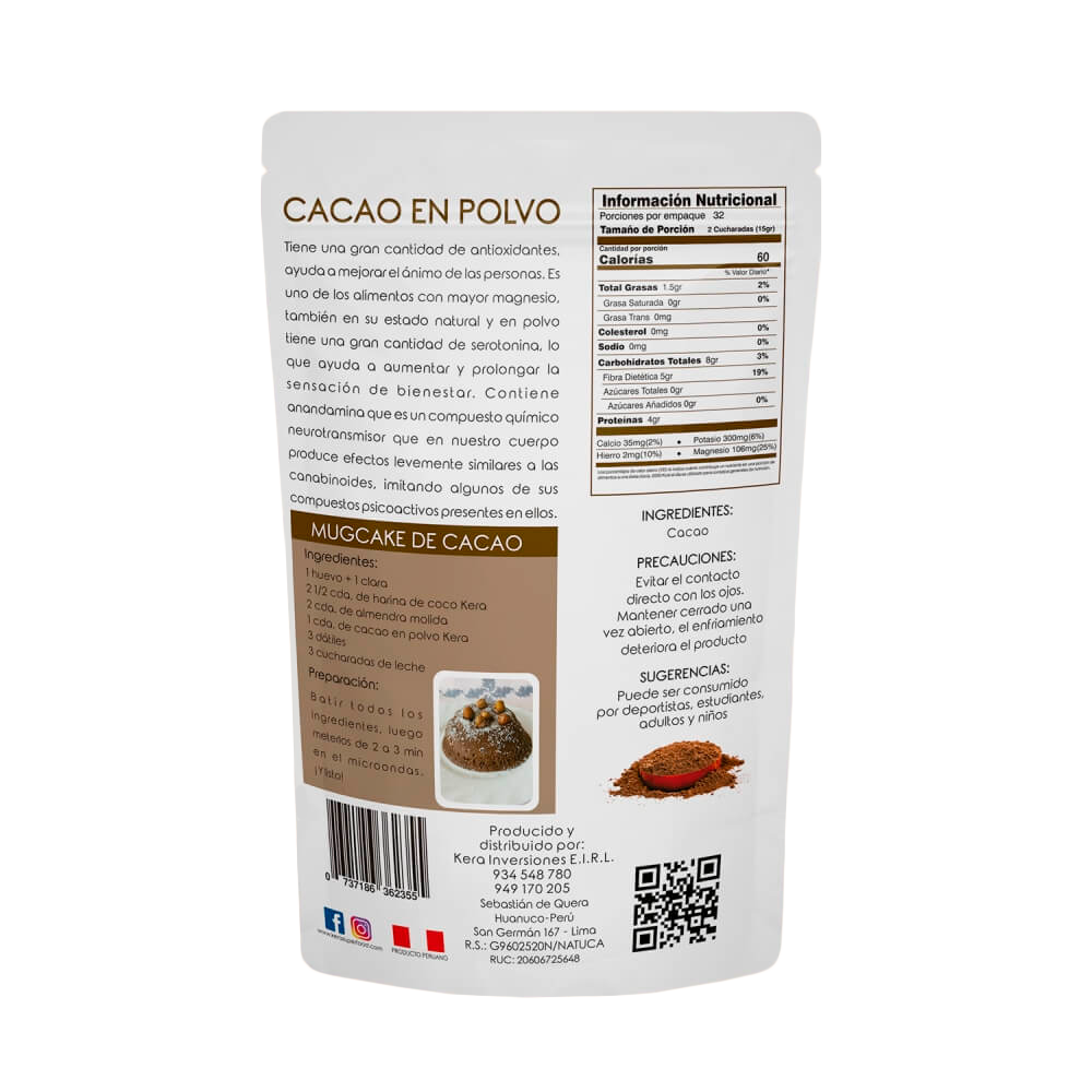 El cacao en polvo Kera Superfood es un superalimento 100% natural, elaborado a partir de granos seleccionados provenientes de Tingo María, Huánuco – Perú, una de las zonas con mayor riqueza agrícola del país. Destaca por su alto poder antioxidante y su extraordinario aporte de minerales esenciales que contribuyen al bienestar integral.