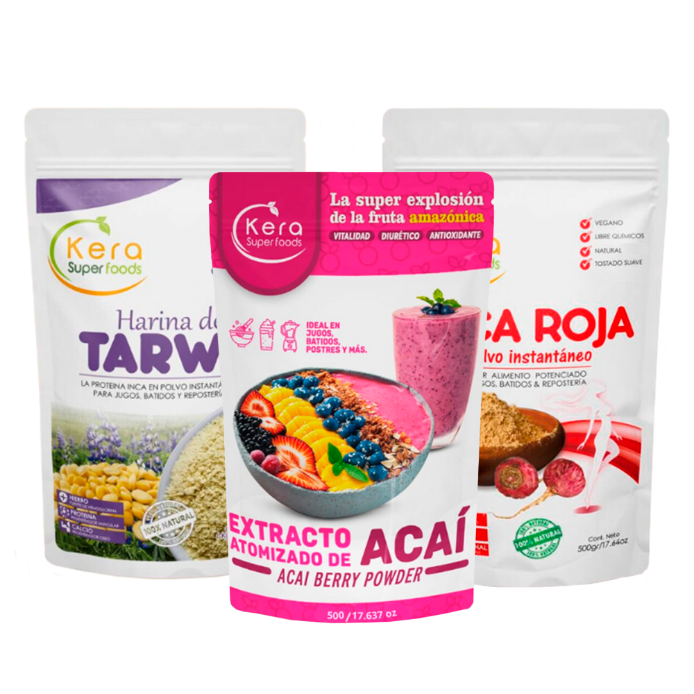 ¡Pack Antioxidante y Energético! Propiedades: Harina de Tarwi: Rica en proteínas, fibra y minerales esenciales, perfecta para la salud muscular y digestiva. Acai Atomizado: Alta en antioxidantes, vitaminas y ácidos grasos esenciales, ideal para la salud cardiovascular y la energía. Maca Roja: Apoya el equilibrio hormonal, fortalece los huesos y aumenta la energía natural. Beneficios: Refuerza la energía, mejora el bienestar hormonal y proporciona antioxidantes para la salud general. Modo de uso: Perfecto para batidos, jugos, avena o como ingrediente en tus recetas saludables. Origen: Tarwi de los Andes Peruanos, Acai de la Amazonía y Maca Roja de Junín