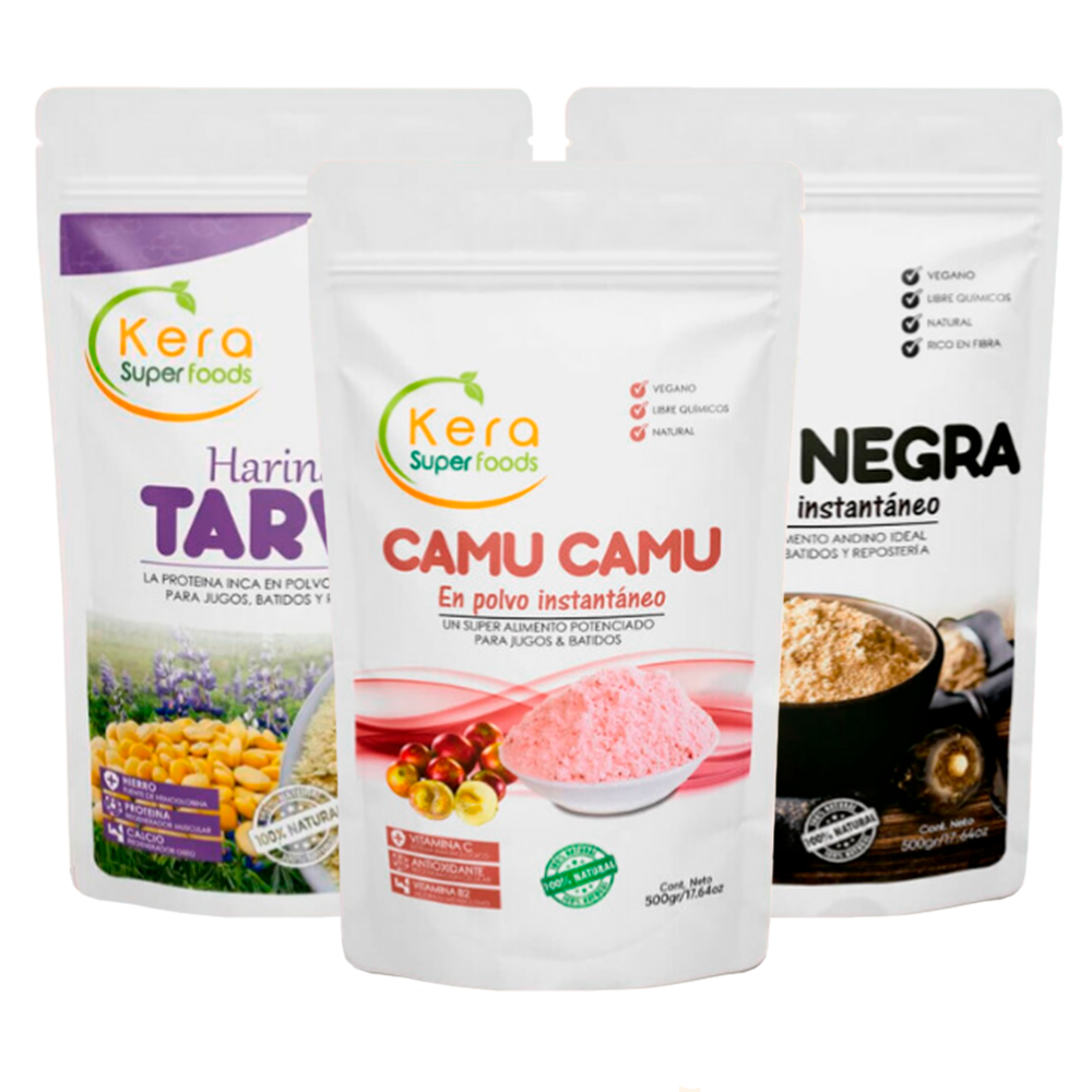 Origen: Tarwi de los Andes Peruanos, Camu Camu de la Amazonía y Maca Negra de Junín