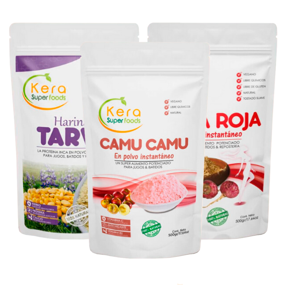 Origen: Tarwi de los Andes Peruanos, Camu Camu de la Amazonía y Maca Roja de Junín